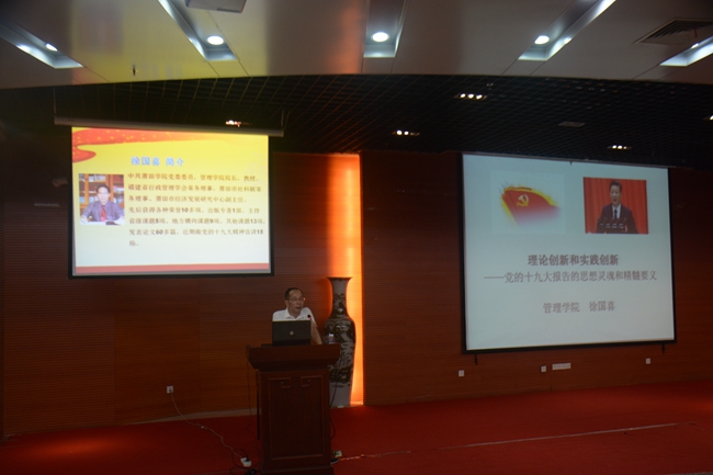 徐国喜结合10个背景资料,通过110页图文并茂的课件,阐述了进入新时代是中国特色社会主义历史方位的新判断、形成新思想是马克思主义中国化的新成果以及开启新征程是国家发展战略和党的历史使命的新谋划三个方面内容。