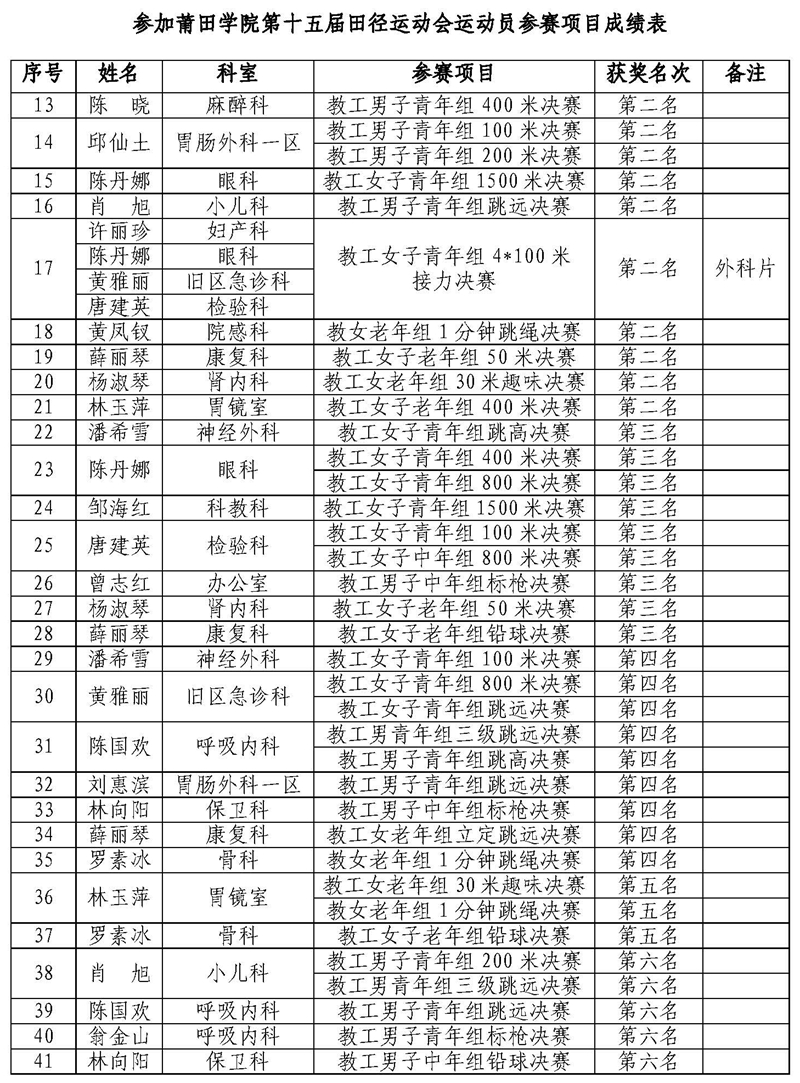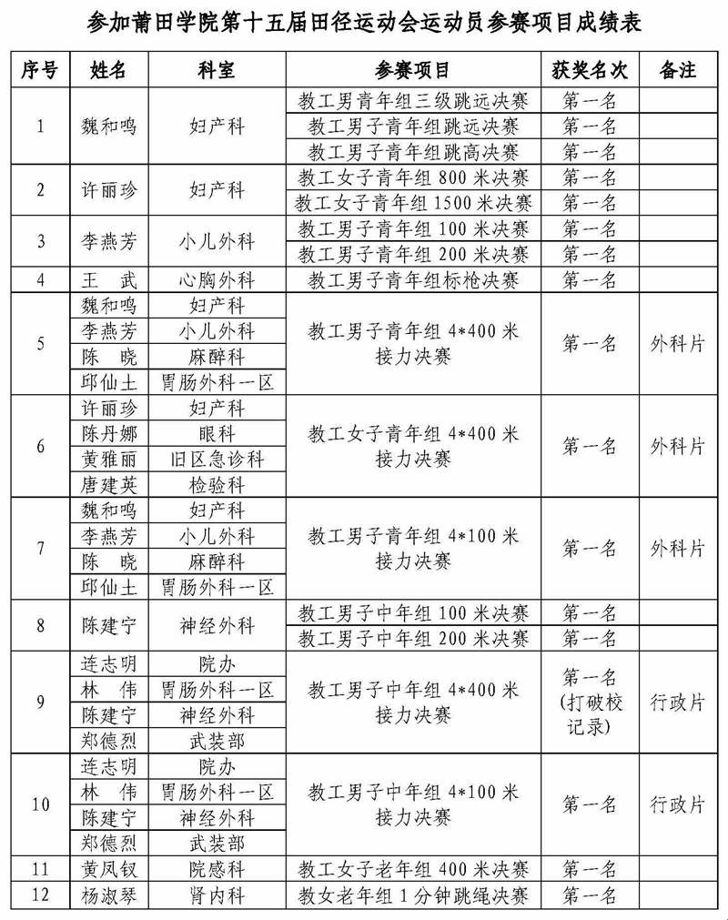 本届运动会比赛中,我院共有5个团体项目荣获第一名,1个团体项目荣获第二名,其中教工男中年组4*400接力打破校记录。在单项比赛中,我院共有12人次荣获第一名,9人次荣获第二名,9人次荣获第三名,9人次荣获第四名,3人次荣获第五名,5人次荣获第六名。另外,我院外科代表队荣获教工团体总分第一名,行政代表队荣获教工团体总分第六名。(陈建飞 黄筱军)