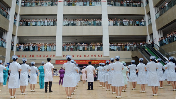 在此之前,医院门诊大厅熙熙攘攘、人头攒动,很多就医者及家属正在大厅办理挂号等手续。突然,一名护士走向大厅中间,举起右手庄严宣誓:“我志愿献身护理事业,……”之后,更多的护士从四面八方汇聚在一起,加入宣誓的队伍,洪亮的声音飘荡在门诊大厅上空。