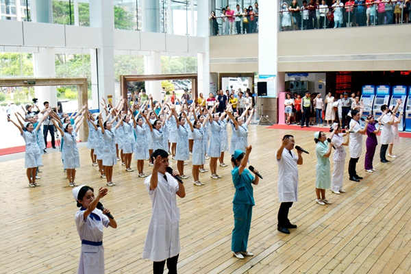 在现场,众多就医者及家属纷纷驻足观看,并拿起手机拍照、录像,他们的脸上泛起了微笑。随后,一曲经过改编的“祝你平安”的歌声,为就医者及家属送上平安和祝福。而现场伴舞的白衣天使们摆出了“5.12”及爱心造型,赢得了在场就医者及家属的阵阵掌声。
