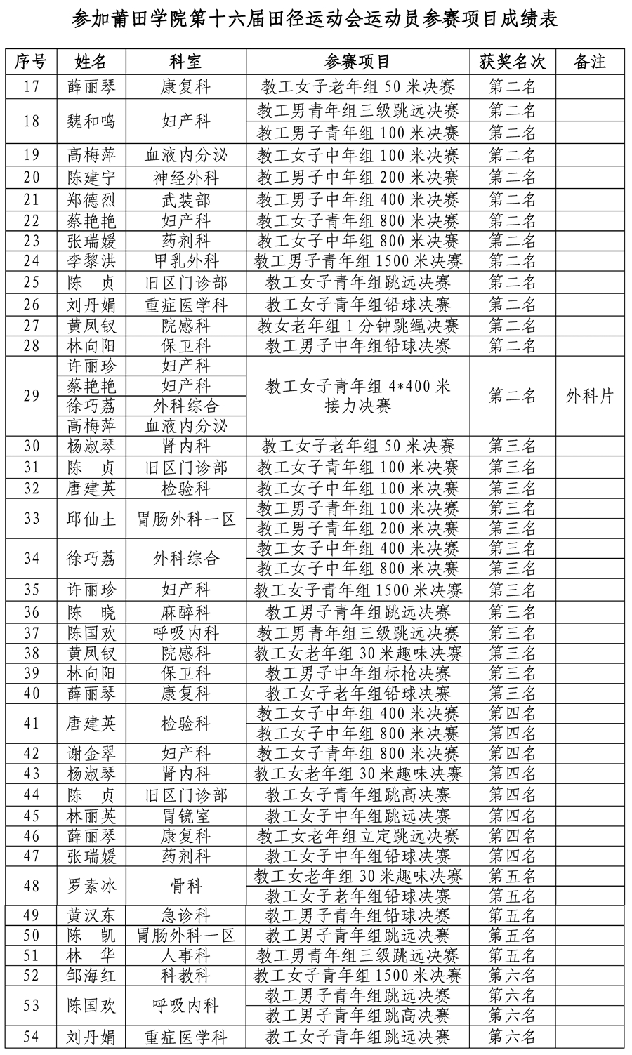 在单项比赛中,我院共有14人次荣获第一名(其中郑德烈在教工男子中年组200米中打破校记录),13人次荣获第二名,13人次荣获第三名,8人次荣获第四名,5人次荣获第五名,4人次荣获第六名。
