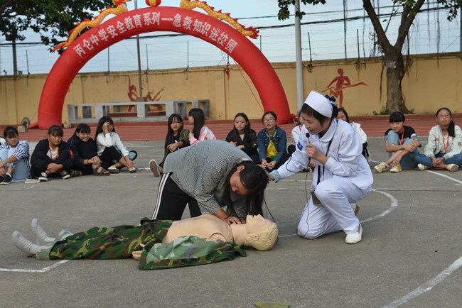 余名师生开展急救知识培训。培训内容包括心肺复苏术、气道梗阻急救法、止血包扎固定法和蛇咬伤的预防和急救等。