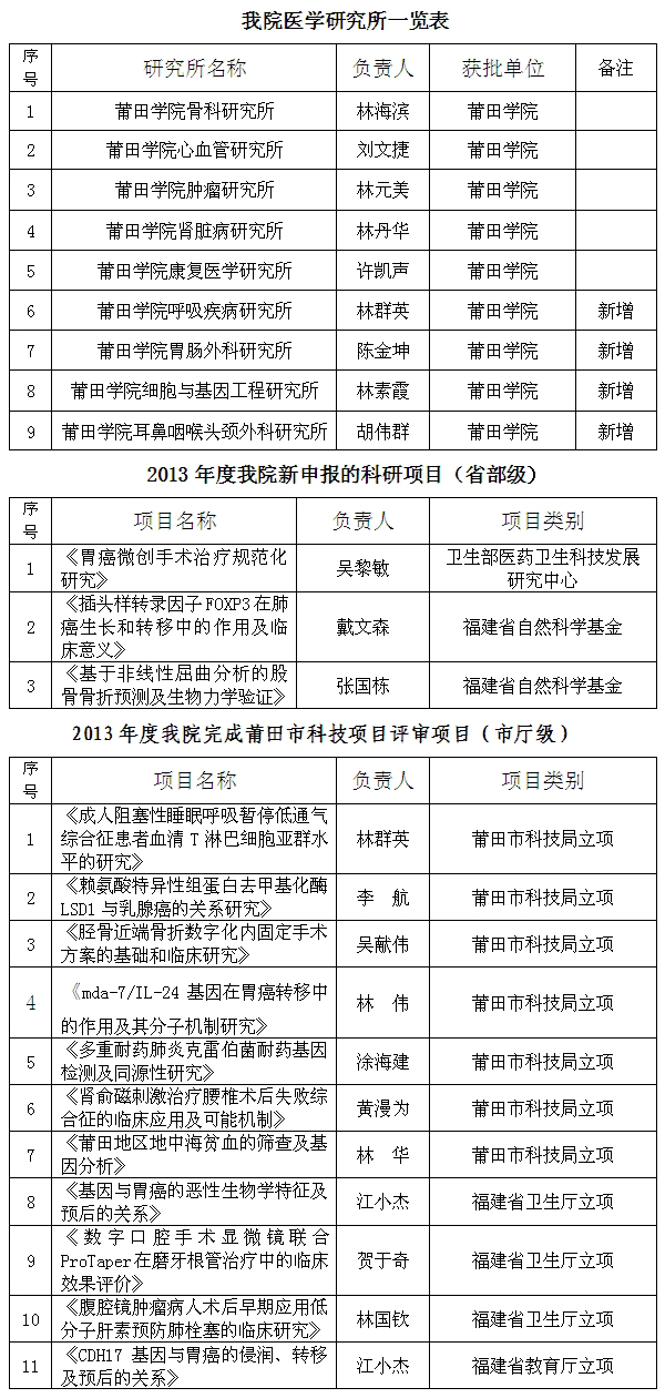 2013年,在院领导的正确谋划下,围绕学科建设重点布局科研工作,我院科研工作迈上了新台阶,科研工作再次取得新的成绩。在医学研究所方面,新增4个研究所,现总数已达9个;在科研项目方面,新申报省部级科研项目3项,已完成市厅级科研项目11个,其中福建省卫生厅项目3项、福建省教育厅项目1项、莆田市科技局项目7项。