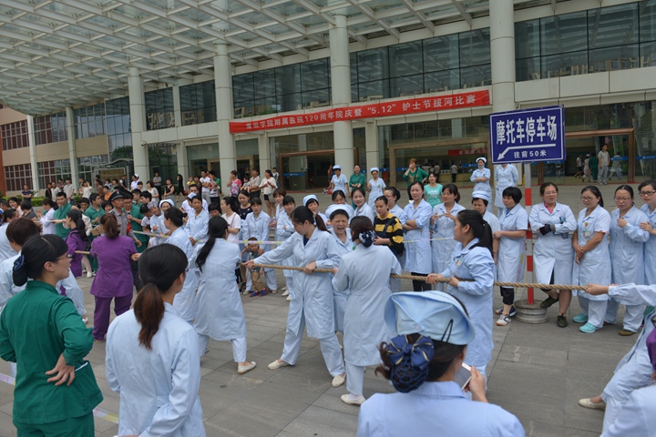 随着裁判员的一声哨响,第一轮比赛在外科片队和妇产科队之间展开。人群立刻变成了欢乐的海洋,口号声、加油声,此起彼伏。参赛的护士选手把精、气、神贯注于一根绳索,让观众的心也随着绳索一起摇摆。现场还有许多前来就诊和正在住院的群众,他们仿佛也暂时忘记了病痛,聚精会神地看比赛,与大家一同沉浸在喜悦之中。