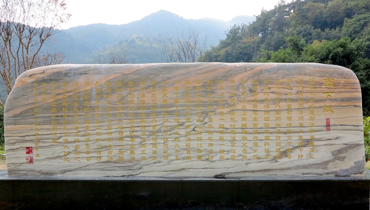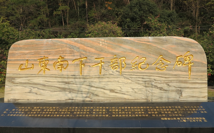 遥望武夷山麓,闽江两岸,东海之滨,九龙江畔;传颂着山东南下干部队伍的丰功伟绩,谱写了齐鲁儿女建设八闽的绚丽诗篇。遥想解放战争,烽烟四起;济南战役,序幕开启。齐鲁儿女紧跟共产党,投笔从戎浴血上前线。跪辞父母,离开家乡;拥别妻儿,壮志凌云。从辽沈,平津到淮海,一路捷报一路歌。向前,向前,向前!聚各路之英豪,扬百万之风帆。渡长江,驰骋江南肃残敌;战苏皖、风雨兼程追穷寇。南下、南下、南下!冒硝烟之战火千里奔袭,又跋山与涉水挺进福建、携齐鲁文化融汇八闽,与当地群众同守海疆。修铁路,筑海堤,建工厂,垦良田。敬业谨慎,克己奉公;英勇果敢,不畏艰险。一种精神,一面旗帜;所到之处,有口皆碑。如今沧海桑田,甲子轮回;第二故乡,一往情深。创业丰碑,忘我奉献;齐鲁口音,难却忘怀。忆往追昔,传统垂循;心若晚霞,无限风光。教育后人,铭记于心;撰立碑记,以示纪念。