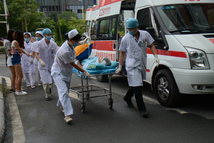 本次演练设计的场景分为两个部分,第一部分是“突发成批量外伤病人的救治与转运”;第二部分是“危重症病人(心肌梗死)的现场处置及转运途中变症的救治。