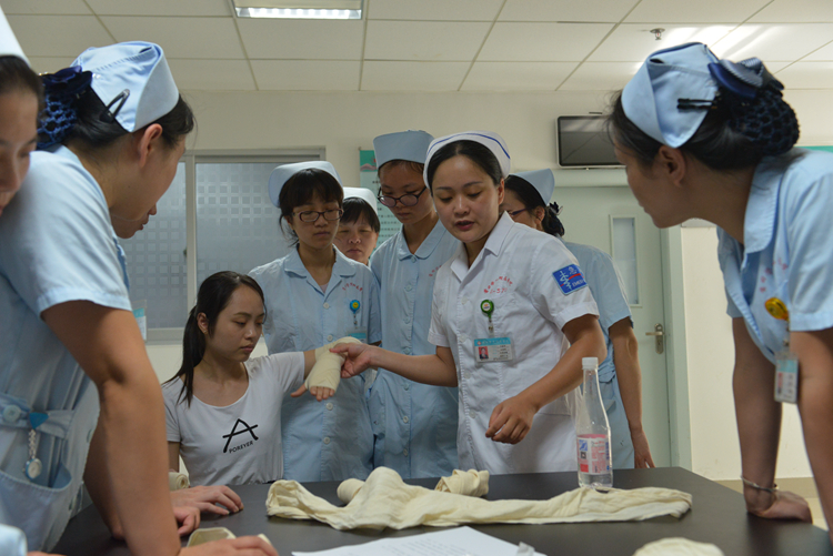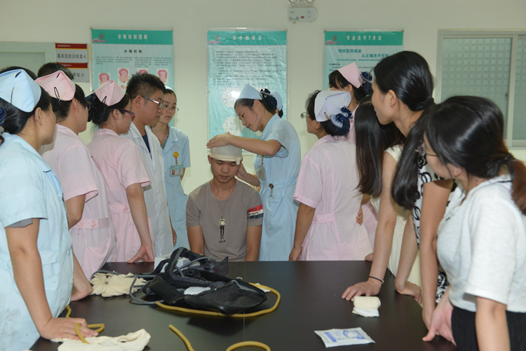 演练前,示范人员先对所有参加人员进行了压迫止血包扎、骨折病人固定转运、各类外伤病人的头部包扎等项目的示范指导,随后让所有学员动手参与直到熟练掌握技巧为止。下午四点,情景演练正式拉开序幕。示范人员严格按照现场抢救病人流程反复精心排练好的情景,演练如真实情景再现般充满紧张感、抢救争分夺秒但不失有条不紊,现场观摩培训的护士聚精会神地观看,有的还使用手机拍摄记录。演练场景设计了为创伤性休克和颅脑损伤的病人进行抢救及转入重症医学科的情节。重点检验了发现病人病变、判断病情、紧急处理、通知医生、抢救过程医护配合、复苏成功、转入重症医学科进一步生命支持、抢救记录。