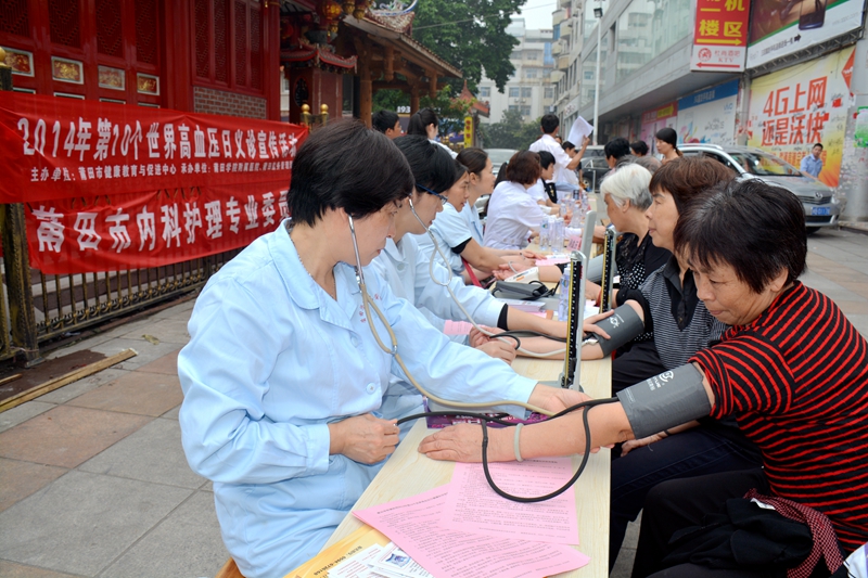 为普及高血压防治知识,增强全民的自我保健意识,5月17日上午,2014年“世界高血压日”主题义诊宣传活动在步行街文峰宫举行。活动由莆田市健康教育与促进中心主办,我院心血管内科高血压俱乐部、莆田盐务管理局、莆田市内科护理专业委员会协办。